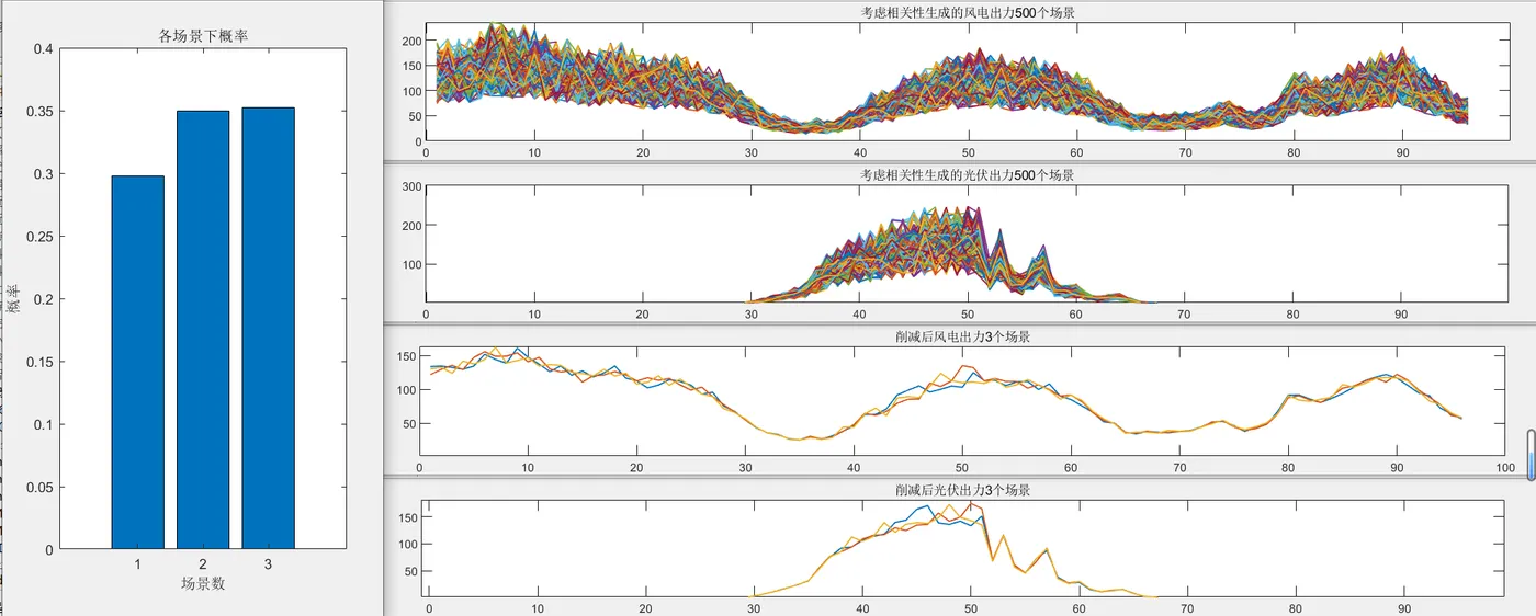 - 场景验证:从统计特性和工程应用两个维度对生成的典型场景进行有效性验证。统计特性验证包括对比典型场景与历史数据的均值、方差、峰度、偏度等统计指标,以及验证风光出力相关性系数的一致性;工程应用验证通过将典型场景应用于电力系统调度优化模型,对比分析调度结果的经济性和安全性,验证场景的实际应用价值。若验证不通过,需返回调整边缘分布建模或Copula函数选择环节,重新优化场景生成模型。