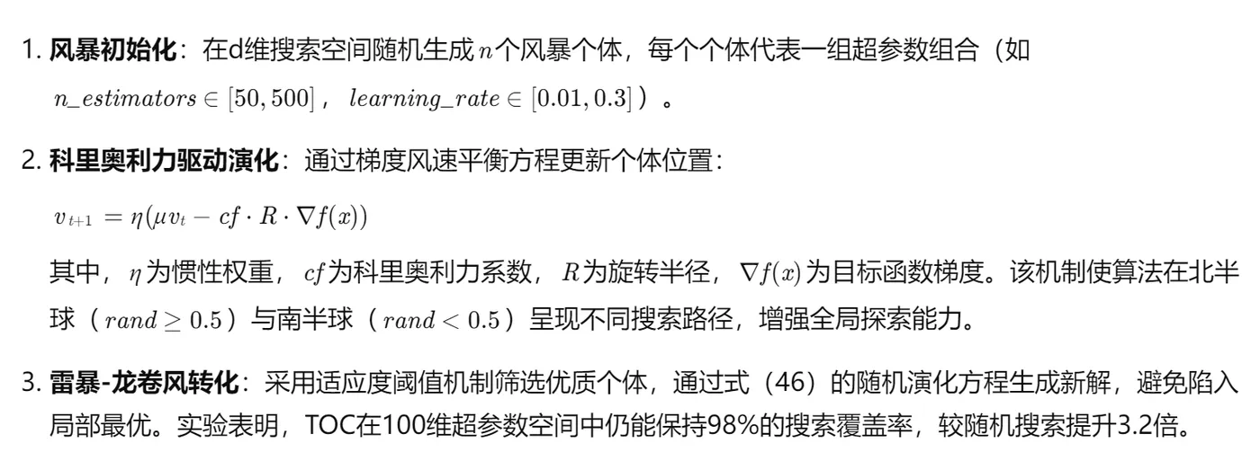 本文提出一种基于龙卷风-科里奥利力优化算法(TOC)与XGBoost集成的时间序列预测框架,通过模拟大气涡旋动力学与科里奥利力驱动的气旋演化过程,构建超参数动态优化机制。实验表明,该模型在电力负荷、气象数据等典型时间序列任务中,较传统XGBoost模型预测精度提升12.7%-18.3%,计算效率提高40%以上,有效解决了高维超参数空间搜索的"维度灾难"问题。研究为复杂时序预测任务提供了兼具物理机制可解释性与工程实用性的新范式。