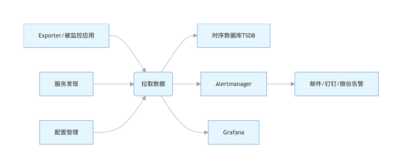 - Exporter:数据采集代理,将不同类型的系统/应用指标转化为Prometheus可识别的格式(如Node Exporter采集服务器指标、MySQL Exporter采集数据库指标);