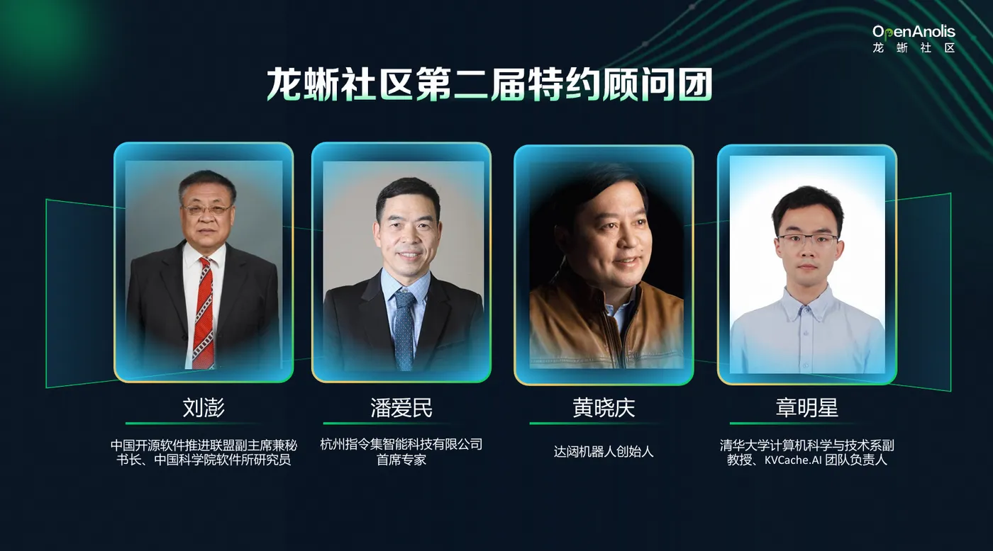 第二届特约顾问团也同样云集了多位行业领军人物,分别由中国开源软件推进联盟副主席兼秘书长、中国科学院软件所研究员刘澎,杭州指令集智能科技有限公司首席专家潘爱民,达闼机器人创始人黄晓庆,清华大学计算机科学与技术系副教授、KVCache.AI 团队负责人章明星四位专家担任。