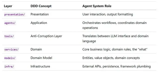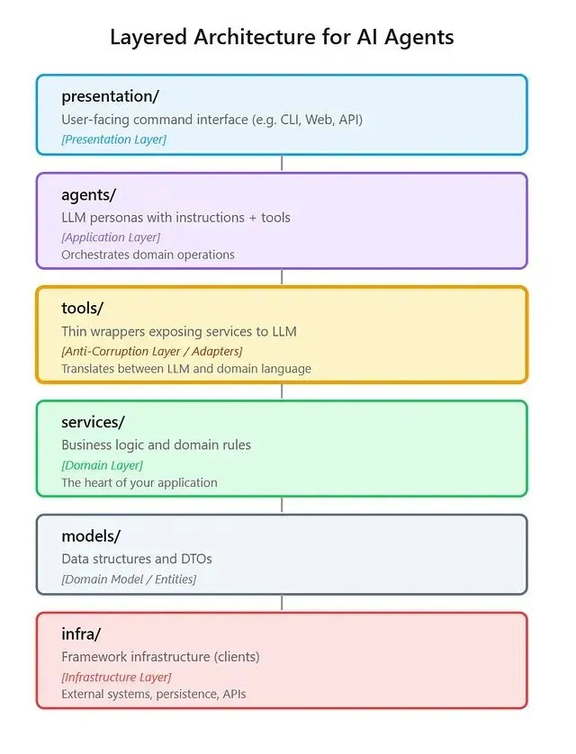 方法本身谈不上新颖。分层架构、关注点分离、领域驱动设计,全是老话题。不过可以看到它们映射到智能体系统时几乎是天然契合的。