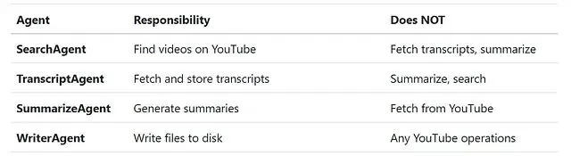 多个 YouTube 视频的信息被综合成了一份连贯、可直接操作的参考文档。SearchAgent 找到对的视频,TranscriptAgent 拿到内容,SummarizeAgent 提炼关键信息,WriterAgent 保存结果。各司其职。