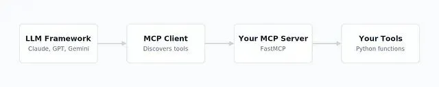 How MCP connects your LLM to external tools: the framework calls the client, which discovers and invokes tools from your server.