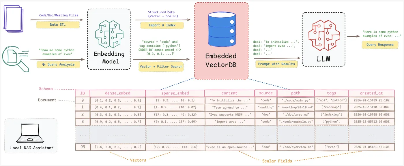 ZVec专为RAG应用设计,内置完整的检索增强生成流程:
