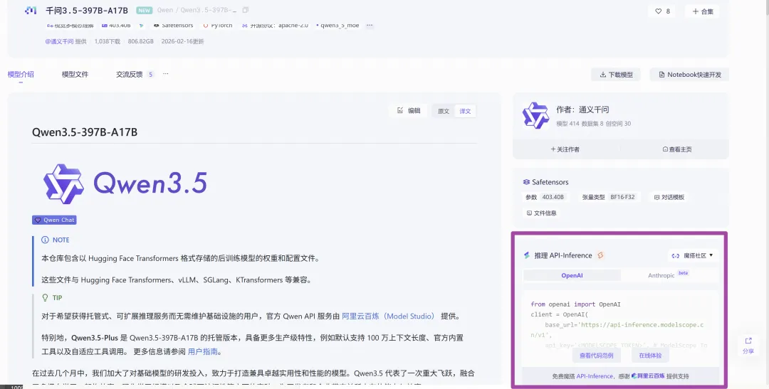 点击即可跳转模型链接:https://www.modelscope.cn/models/Qwen/Qwen3.5-397B-A17B