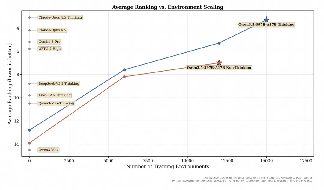 官方Blog提到,相比 Qwen3 系列,Qwen3.5 的 Post-training 性能提升主要归功于强化学习(RL)任务和环境的全面扩展。团队不再局限于针对特定指标或狭窄类别的 query 进行优化,而是更加强调 RL 环境的难度与可泛化性。实验证明,随着 RL Environment 的 scaling,模型在通用 Agent 能力上获得了显著增益。这种“授人以渔”的训练策略,使得模型在 Tool-Decathlon、MCP-Mark 等工具调用与规划任务上表现突出。