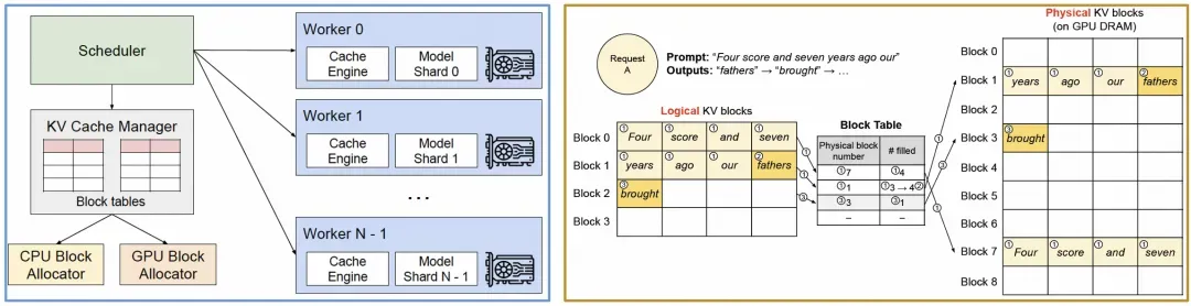 图 12. vLLM 的系统架构,以及 PagedAttention 内存分配机制
