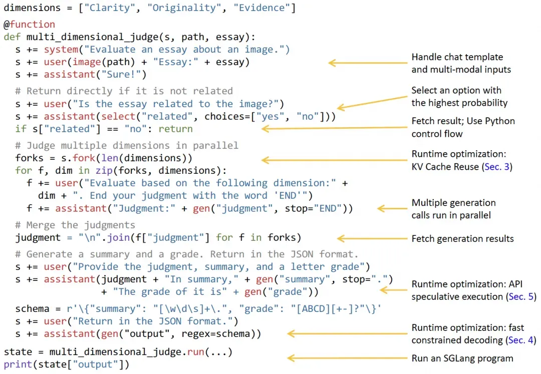 我们首先囫囵吞枣般过一下如何写一个 SGLang 风格的前端机。图 15 展示了一个基于 SGLang 实现的支持多模态输入的文章评审功能。这里会添加一些系统提示词(System Prompt),然后将图片,以及评语部分一并作为 Prompt 提交,根据相关性评估结果,如果不相关,则直接返回;否则,并行地从“Clarity”,“Originality”,“Evidence”三个维度做进一步的评审。最后,还明确地约束输出为 JSON 格式。这个实现看着还是比较简洁的,不是么?