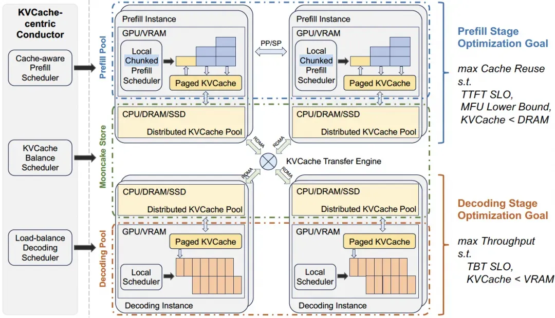 还有,就是左侧的全局调度器,KVCache-centric Conductor,这里也包括三块细分的调度器,分别是面向 Prefill 阶段的 Cache-aware Scheduler,它不仅仅考虑尽可能复用 KV Caches,还进一步考虑了每个 Prefill Instance 的请求队列的忙碌情况;然后是面向 Decoding 阶段的 Load-balance Scheduler,主要考虑每个 Decoding Instance 的负载均衡情况;还有个关键的 KVCache Balance Scheduler,也就是核心的 Mooncake Store,它统筹了全局的各类资源,提供了 Distributed KVCache Pool,是既管 Storage,又管 Transfer,妥妥的核心竞争力。
