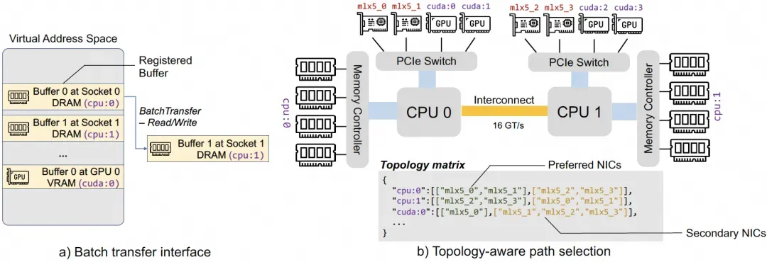 而 Transfer Engine 这一边,如图 23 所示,每个 Server 都会生成一个拓扑矩阵(topology matrix),并在集群内广播。这个拓扑矩阵记录了啥?不同 memory 类型对应的 preferred NICs 列表,以及 secondary NICs 列表。图 23 中的例子,cpu:0 对应的 preferred NICs 列表有两个 [mlx5_0, mlx5_1]。如果此时有个传输任务,需要把数据从 buffer 0(分配给了 cpu:0) 传输至 buffer 1(分配给了 cpu:1),那么 local NIC 可能会选择 mlx5_0,而 target NIC 则可能选择 mlx5_3。此外,Transfer Engine 会通过 local NUMA,或者 GDR(GPU Direct RDMA)through the local PCIe 来加速 RDMA 相关操作。引入拓扑矩阵的好处,一方面是支持故障逃逸;另一方面是大的 request 请求可以切片后并行传输,充分地利用 RDMA 网络传输带宽。