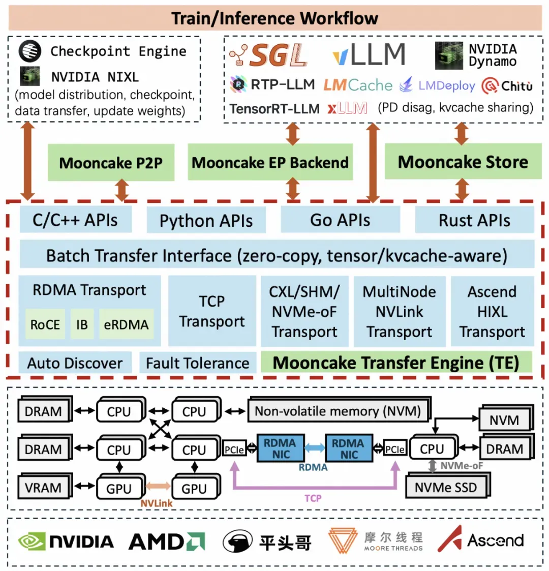 - 抽象出统一 API 接口,隐藏硬件相关的技术细节,支持 DRAM,VRAM,以及 NVMe 等存储设备之间的数据移动;隐藏 RDMA 连接管理的复杂性,支持 TCP,RDMA (InfiniBand/RoCEv2/eRDMA/NVIDIA GPUDirect),以及NVMe over Fabric (NVMe-of) 等等网络通信协议;