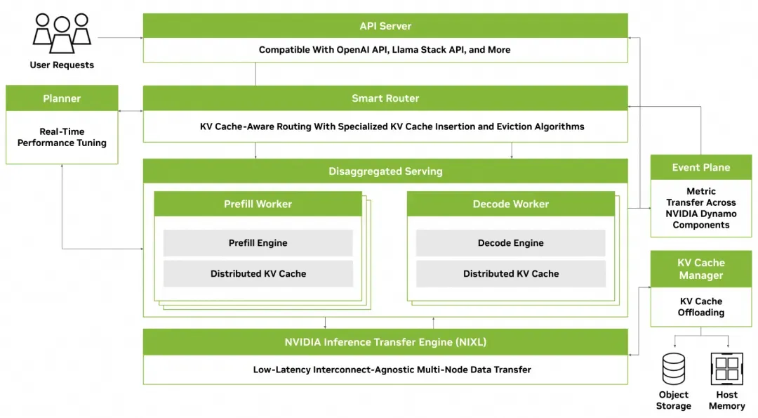 在 2025 年 3 月份 GTC 2025 峰会上,NVIDIA 面向广大 Reasoning AI Models 重磅推出了高吞吐、低延迟的开源推理框架 - Dynamo(是的,跟 AWS 的 Dynamo 数据库重名了)。这个出道时间也比较微妙,Dynamo 宣称的几大优势在前面几个 LLM Inference 重量级选手面前都算不上太新鲜,可能其最大优势还是在 NVIDIA 原厂支持吧 ......