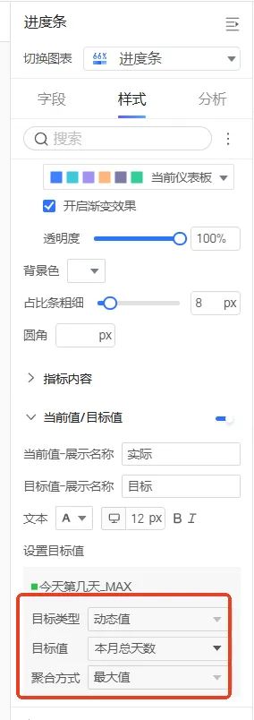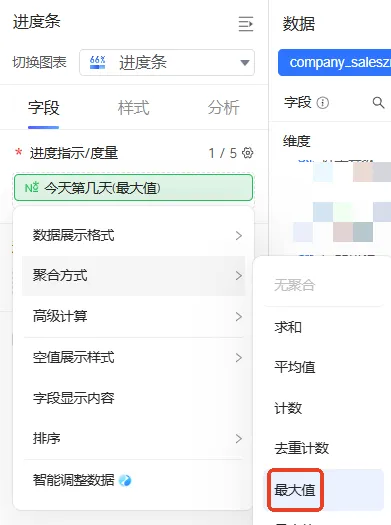 Step4. 进度条中度量选择“今天第几天”,聚合方式选择“最大值”,如下图所示: