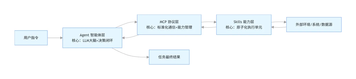 Agent是智能决策的核心主体,Skills是Agent执行任务的原子能力单元,MCP是Agent与Skills之间的标准化通信桥梁与能力管理规范。