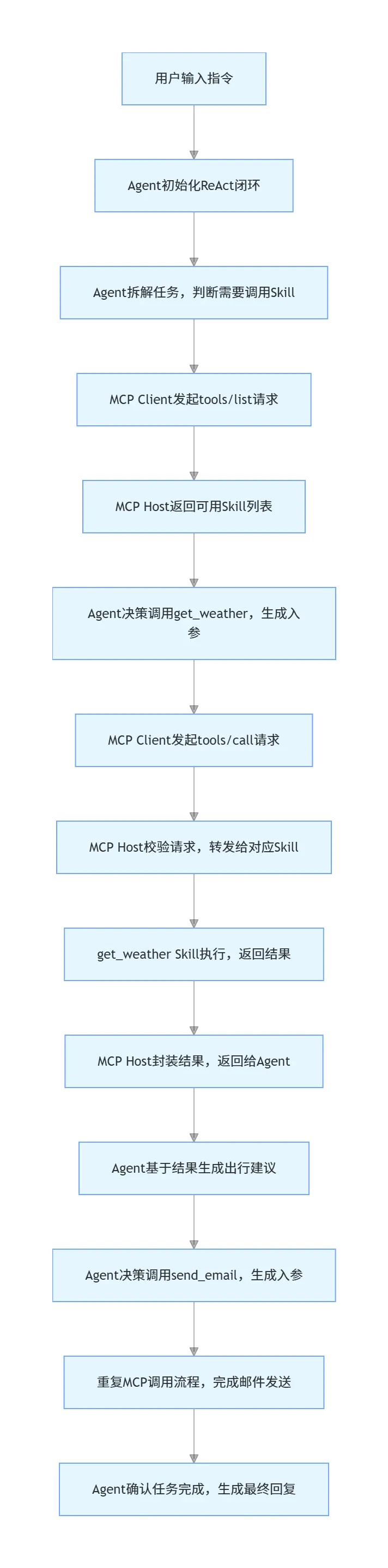 | 4 | 能力返回 | 接收MCP返回的Skill标准化定义,理解每个Skill的用途 | MCP Host返回已注册的Skill列表: 1. get_weather:获取指定城市指定日期的天气 2. send_email:发送邮件到指定邮箱 包含每个Skill的入参Schema、功能描述 |