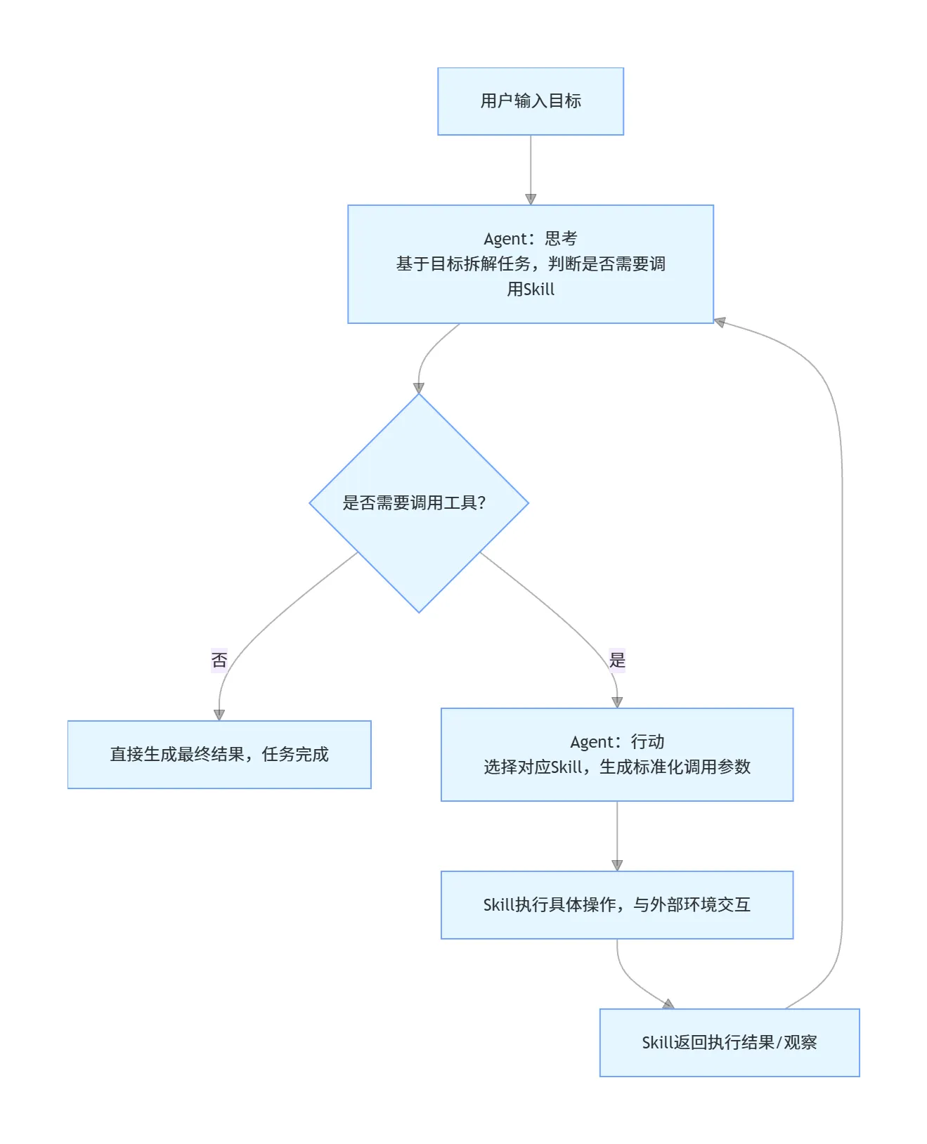 - 接收Skill执行结果,迭代推理,直到完成用户目标,形成完整闭环