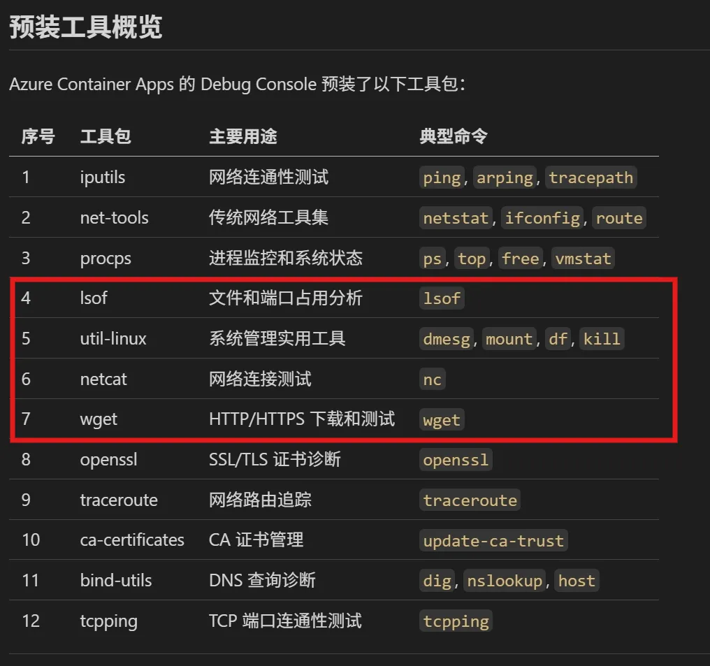 文章“【Azure Container App】Debug Console的调试工具指南”中,介绍了12种Azure Contianer App Debug Console模式下预装的调试工具。