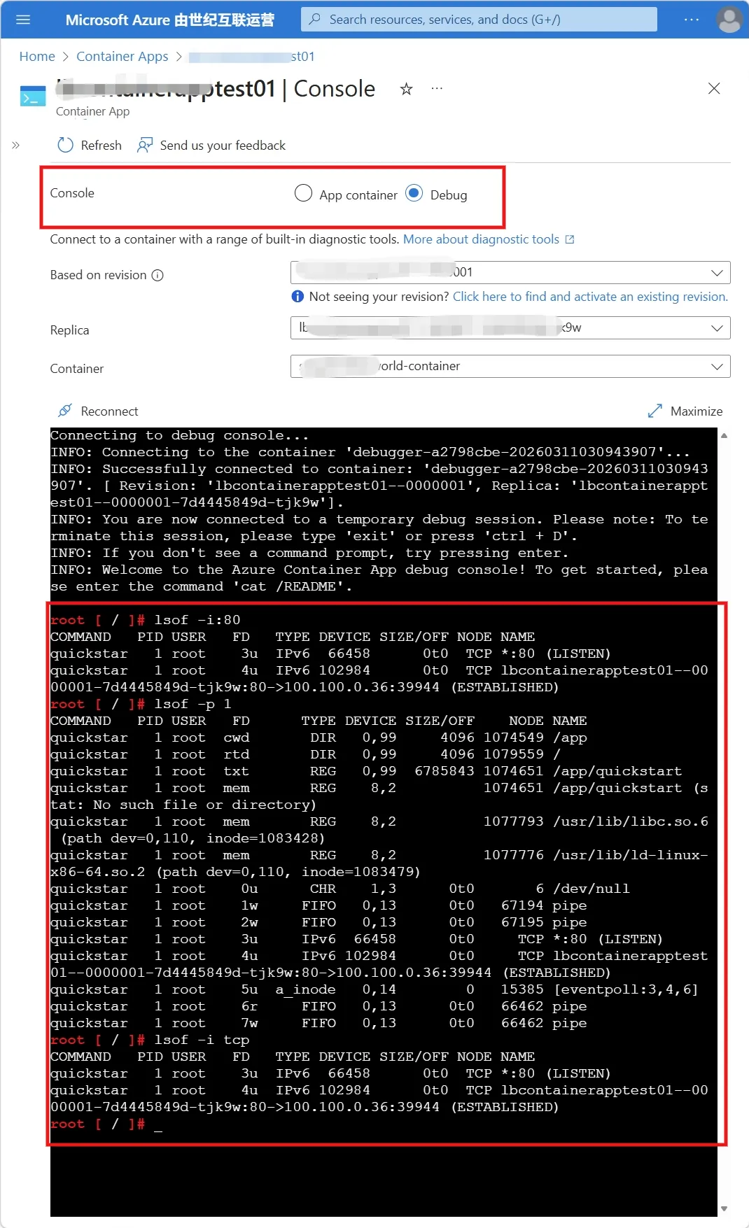 Connect to a container debug console in Azure Container Apps : https://learn.microsoft.com/en-us/azure/container-apps/container-debug-console?tabs=bash#built-in-tools-in-the-debug-console