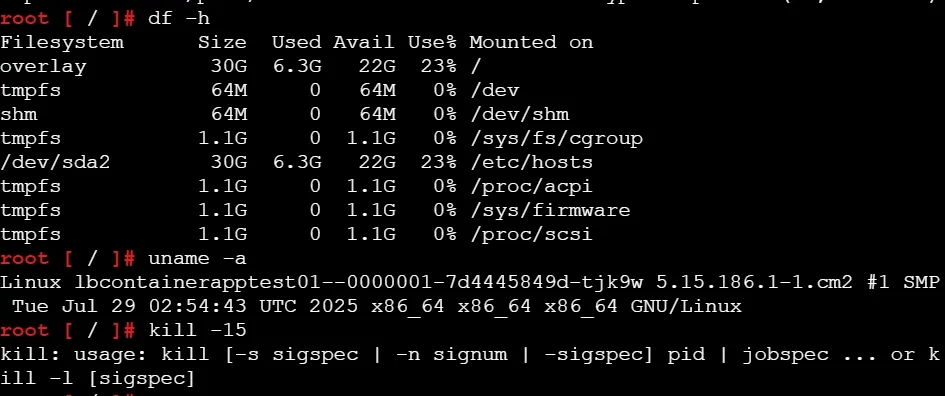 df 命令显示文件系统的磁盘空间使用情况。当容器报告磁盘空间不足时,df -h 可以快速定位是哪个文件系统空间不足。在容器环境中,需要特别关注 / 根文件系统和挂载的持久化存储的使用情况。