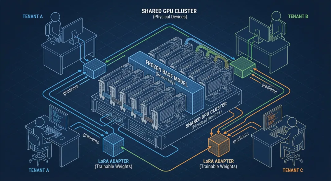 同时,受 Tinker 服务化能力的启发,我们进一步探索了训练架构的边界:如何在同一套基础模型部署之上,实现多租户并发 LoRA 训练?这种模式不仅能极大地提升算力效率,更为实现真正的 Serverless 化“训练即服务(TaaS)”提供了可行路径。