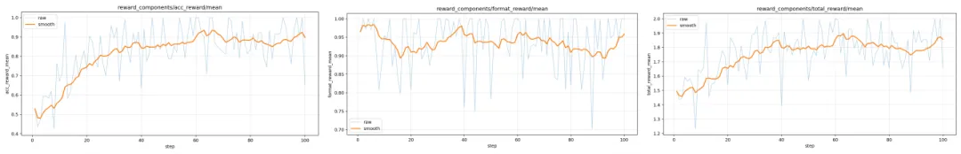 可以看到,在训练效果方面,两个框架在训练过程中展现奖励曲线趋势基本一致;而在训练效率方面,Twinkle 完成一个global batch 的平均耗时约为 70 秒,而 veRL约为 80 秒。两者训练速度相近。
