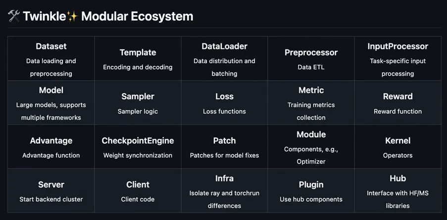 Twinkle 最重要也是最核心的设计理念就是“组件化”。针对大模型场景,把每个需要使用的,可以独立构建的部分都收敛为标准化的模块。例如: