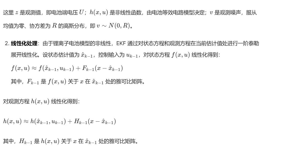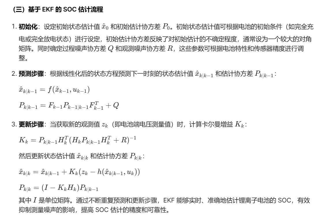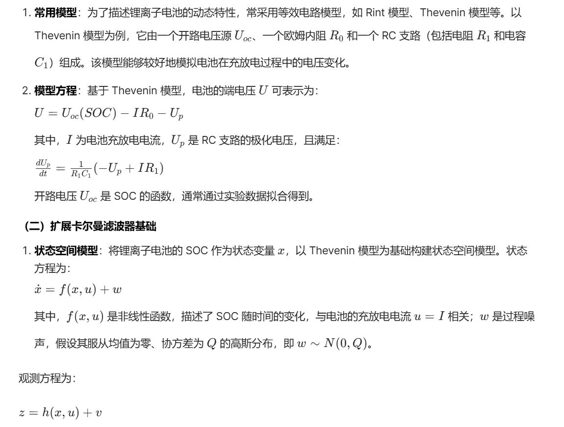 扩展卡尔曼滤波器(Extended Kalman Filter,EKF)作为一种强大的状态估计工具,在处理非线性系统的状态估计方面具有显著优势。锂离子电池的电化学过程呈现非线性特征,EKF 能够通过对非线性系统进行线性化近似,利用系统的状态方程和观测方程,结合测量数据,递推地估计电池的 SOC。它不仅可以实时处理测量噪声,还能根据系统的动态变化调整估计结果,有效提高 SOC 估计的准确性和可靠性。