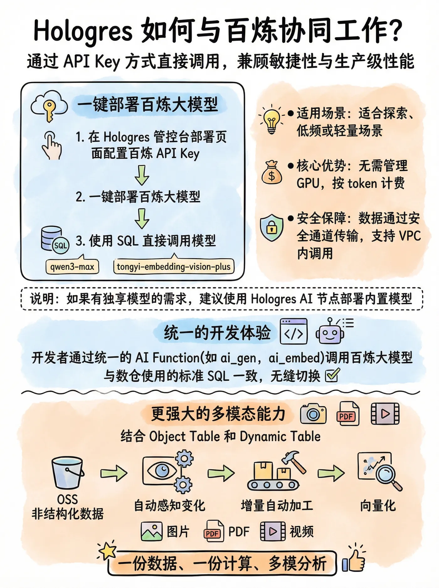 - 工程成本高:自建 LLM 服务需 GPU、API 网关、限流熔断……数据团队难以维护。 → 百炼提供托管式大模型服务,Hologres 通过函数一键调用,零运维。