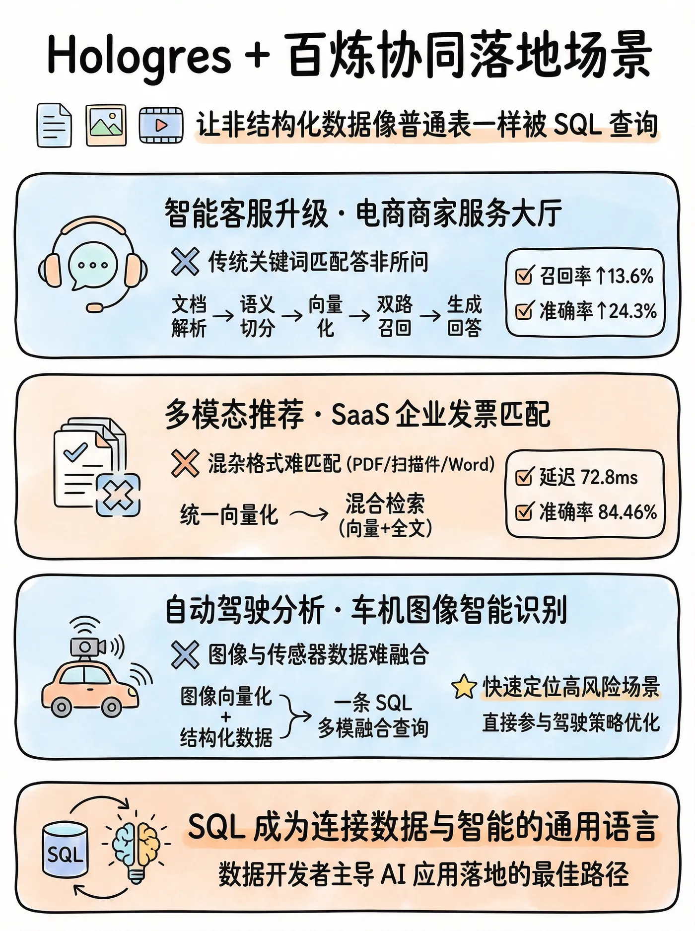 这些案例共同揭示了一个趋势:AI 正从算法黑盒走向数据基础设施的一部分。Hologres + 百炼让非结构化数据像普通表一样被管理、加工、查询,而 SQL 成为了连接数据与智能的通用语言——这正是数据开发者主导 AI 应用落地的最佳路径。