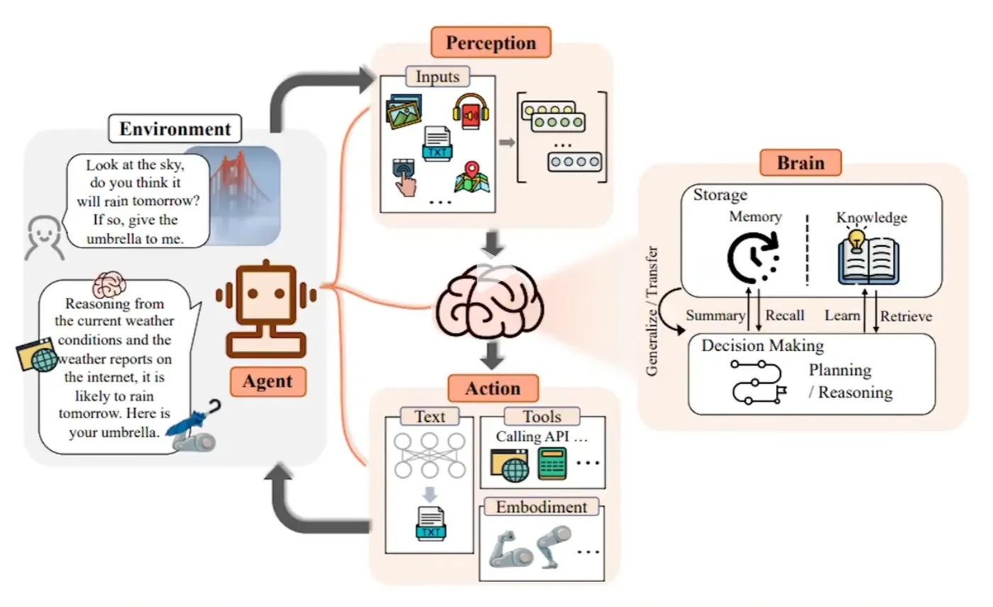 — 环境感知组件,包括文本输入、视觉/语音/传感器输入的编码、信息抽取与状态更新;在物理或多模态场景中特别重要。 - Action(行动/工具)