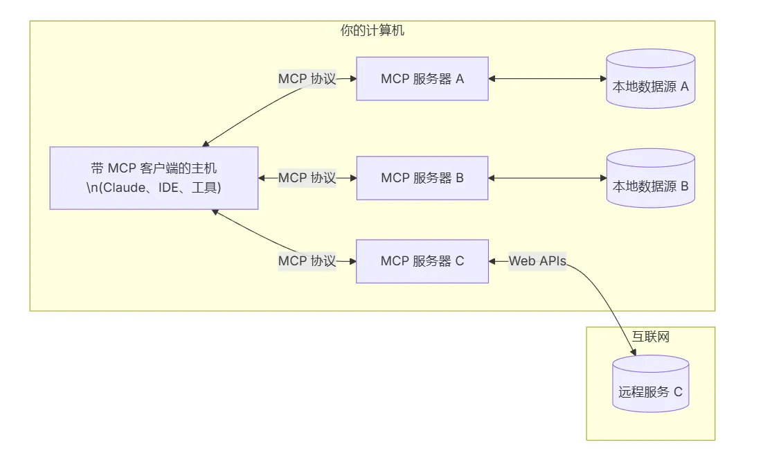MCP由Anthropic公司于2024年发布的"模型与外部世界连接"的统一开放标准:无需为每个数据库 API或开发工具"手工编写一次性集成代码(让模型与之交互)" 只需运行或连接MCP服务器 这些服务会以标准化格式暴露工具 资源和提示词 任何支持MCP的客户端( 如IDE 智能体运行时 聊天应用) 都能自动发现这些能力 实现"调用工具 流式传输结果 保持共享上下文"等功能