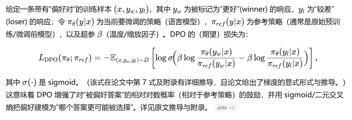 - 然后用强化学习(PPO/REINFORCE)在策略空间上最大化该奖励,同时用 KL 惩罚防止策略偏离基准模型。这整个 pipeline 计算复杂、不稳定、需要采样与大量超参调优。DPO 通过一个变换(将隐含奖励参数化为策略的对数比),把最终要得到的最优策略表示出来,从而把“学奖励 + RL”两步合成一步的“直接学习策略”的二元分类/最大似然问题。
