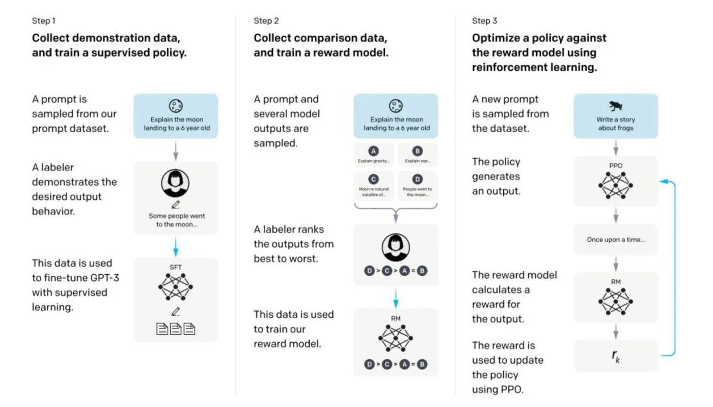 第二步:收集比较数据并训练奖励模型(Reward Model,RM) - 目的:建立一个能评估输出好坏的“奖励模型”。