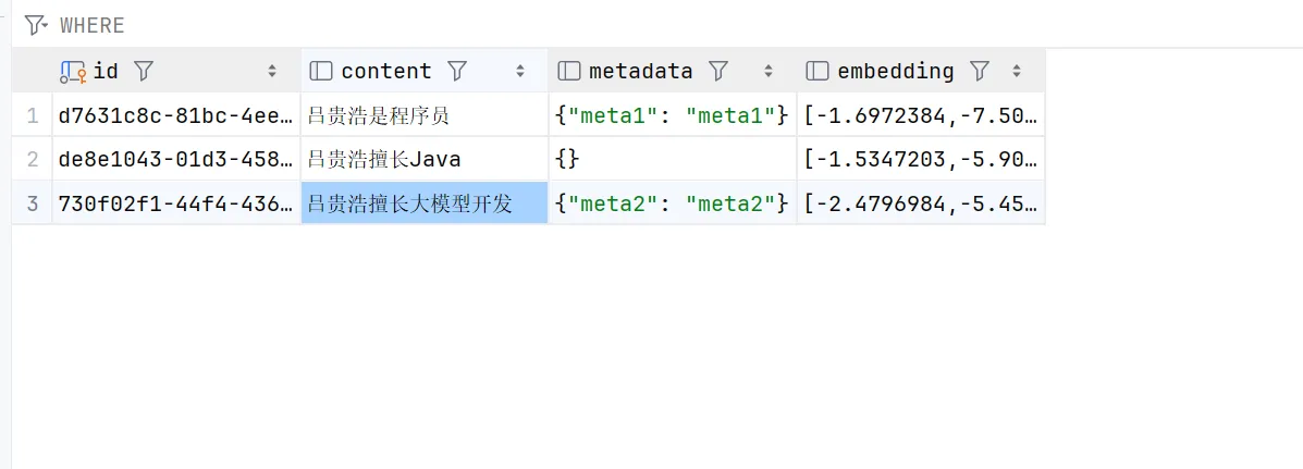 import jakarta.annotation.Resource; import org.junit.jupiter.api.Assertions; import org.junit.jupiter.api.Test; import org.springframework.ai.document.Document; import org.springframework.ai.vectorstore.SearchRequest; import org.springframework.ai.vectorstore.VectorStore; import org.springframework.boot.test.context.SpringBootTest; import java.util.List; import java.util.Map; @SpringBootTest class PgVectorVectorStoreConfigTest { @Resource private VectorStore pgVectorVectorStore; @Test void pgVectorVectorStore() { List<Document> documents = List.of( new Document("吕贵浩是程序员", Map.of("meta1", "meta1")), new Document("吕贵浩擅长Java"), new Document("吕贵浩擅长大模型开发", Map.of("meta2", "meta2"))); // 添加文档 pgVectorVectorStore.add(documents); // 相似度查询 List<Document> results = pgVectorVectorStore.similaritySearch(SearchRequest.builder().query("吕贵浩是谁").topK(3).build()); Assertions.assertNotNull(results); } }