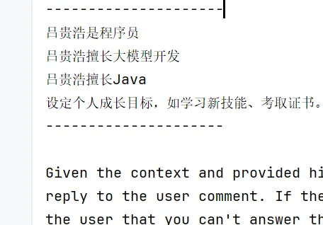 @Resource private VectorStore pgVectorStore; public String doChatWithRag(String message, String chatId) { ChatResponse chatResponse=chatClient.prompt() .user(message) .advisors(spec -> spec.param(ChatMemory.CONVERSATION_ID, chatId)) .advisors(new MyLoggerAdvisor()) //RAG // .advisors(new QuestionAnswerAdvisor(loveAppVectorStore)) //云上RAG // .advisors(loveAppRagCloudAdvisor) //PgRAG .advisors(new QuestionAnswerAdvisor(pgVectorStore)) .call() .chatResponse(); String content=chatResponse.getResult().getOutput().getText(); log.info("content: {}", content); return content; } @Test void doChatWithRag() { String chatId = UUID.randomUUID().toString(); String message = "吕贵浩是谁?"; String answer= loveApp.doChatWithRag(message, chatId); Assertions.assertNotNull(answer); }