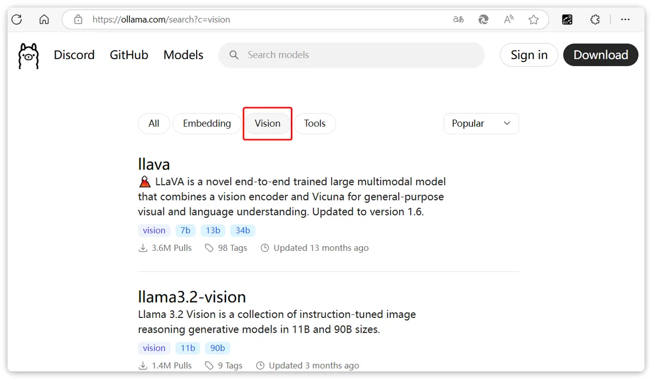 以ollama为例,在搜索时点击vison,就能找到支持图像识别的模型: 编辑