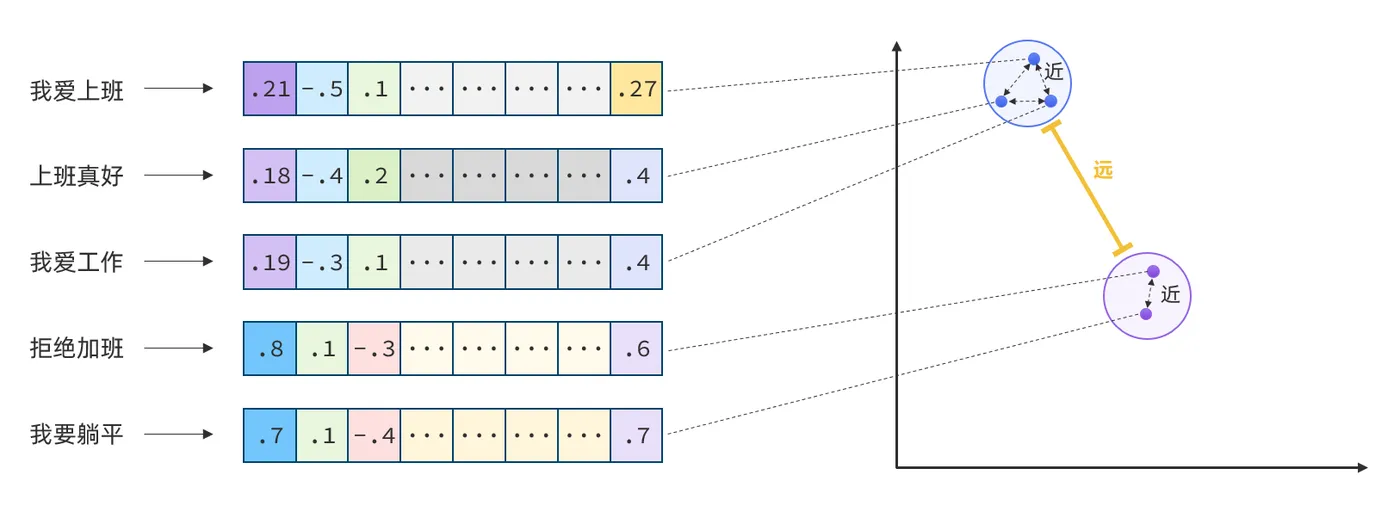 通常,两个向量之间欧式距离越近,我们认为两个向量的相似度越高。(余弦距离相反,越大相似度越高)所以,如果我们能把文本转为向量,就可以通过向量距离来判断文本的相似度了。现在,有不少的专门的向量模型,就可以实现将文本向量化。一个好的向量模型,就是要尽可能让文本含义相似的向量,在空间中距离更近: