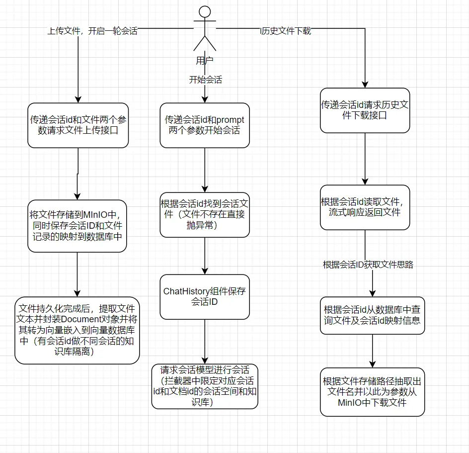 /** * 文件阅读助手 * @param * @param * @return */ @PostMapping(value = "/chat", produces = "text/html;charset=utf-8") @Operation(summary = "文件阅读助手") public Flux<String> chat(@RequestBody PDFDto pdfDto) { String prompt = pdfDto.getPrompt(); String chatId = pdfDto.getChatId(); // 1.找到会话文件 Resource file = fileRepository.getFile(chatId); if (!file.exists()) { // 文件不存在,不回答 throw new RuntimeException("会话文件不存在!"); } // 2.保存会话id chatHistoryRepository.save("pdf", chatId); // 3.请求模型 return pdfChatClient.prompt() .user(prompt) .advisors(a -> a.param(CHAT_MEMORY_CONVERSATION_ID_KEY, chatId)) .advisors(a -> a.param(FILTER_EXPRESSION, "file_name == '" + file.getFilename() + "'")) .stream() .content(); } /** * 阅读助手文件上传 */ @PostMapping("/upload/{chatId}") @Operation(summary = "阅读助手文件上传") public Result uploadPdf(@PathVariable String chatId, @RequestParam("file") MultipartFile file) { try { // 1. 校验文件是否为PDF格式 if (!Objects.equals(file.getContentType(), "application/pdf")) { return Result.fail("只能上传PDF文件!"); } // 2.保存文件 boolean success = fileRepository.save(chatId, file.getResource()); if (!success) { return Result.fail("保存文件失败!"); } // 3.写入向量库 this.writeToVectorStore(file.getResource()); return Result.success(); } catch (Exception e) { log.error("Failed to upload PDF.", e); return Result.fail("上传文件失败!"); } } /** * 阅读助手文件下载 */ @GetMapping("/file/{chatId}") @Operation(summary = "阅读助手文件下载") public ResponseEntity<Resource> download(@PathVariable("chatId") String chatId) throws IOException { // 1.读取文件 Resource resource = fileRepository.getFile(chatId); if (!resource.exists()) { return ResponseEntity.notFound().build(); } // 2.文件名编码,写入响应头 String filename = URLEncoder.encode(Objects.requireNonNull(resource.getFilename()), StandardCharsets.UTF_8); // 3.返回文件 return ResponseEntity.ok() .contentType(MediaType.APPLICATION_OCTET_STREAM) .header("Content-Disposition", "attachment; filename=\"" + filename + "\"") .body(resource); } // private void writeToVectorStore(Resource resource) { // // 1.创建PDF的读取器 // PagePdfDocumentReader reader = new PagePdfDocumentReader( // resource, // 文件源 // PdfDocumentReaderConfig.builder() // .withPageExtractedTextFormatter(ExtractedTextFormatter.defaults()) // .withPagesPerDocument(1) // 每1页PDF作为一个Document // .build() // ); // // 2.读取PDF文档,拆分为Document // List<Document> documents = reader.read(); // // 3.写入向量库 // vectorStore.add(documents); // } private void writeToVectorStore(Resource resource) { try { // 使用 Tika 解析 PDF 内容 ContentHandler handler = new BodyContentHandler(-1); // 不限制内容长度 Metadata metadata = new Metadata(); ParseContext context = new ParseContext(); PDFParser parser = new PDFParser(); // 解析 PDF 并提取文本 parser.parse(resource.getInputStream(), handler, metadata, context); String content = handler.toString(); // 关键修复:将 Metadata 转换为 Map Map<String, Object> metadataMap = new HashMap<>(); for (String name : metadata.names()) { metadataMap.put(name, metadata.get(name)); } // 补充文件名到元数据(可选) metadataMap.put("file_name", resource.getFilename()); // 创建 Document 并写入向量库 Document document = new Document( resource.getFilename(), // 文档 ID content, // 提取的文本内容 metadataMap // 转换后的元数据 Map ); vectorStore.add(List.of(document)); } catch (Exception e) { log.error("Failed to parse PDF with Tika", e); throw new RuntimeException("解析PDF失败", e); } }