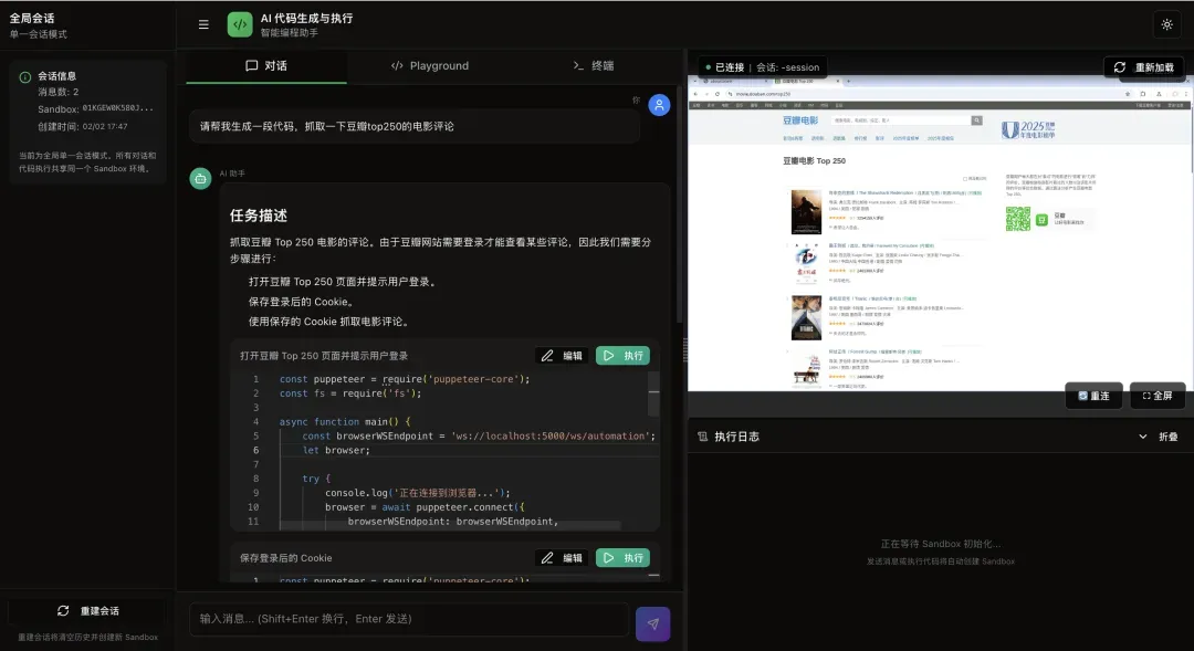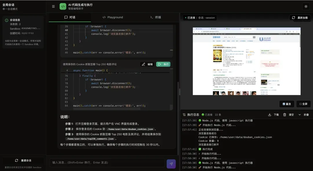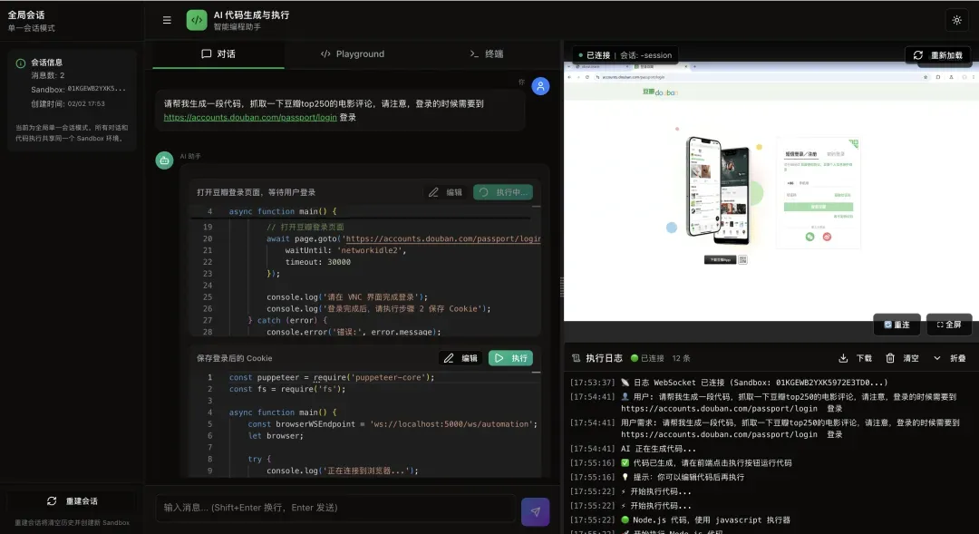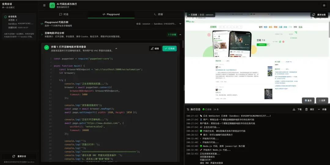 用户: 登录豆瓣,然后获取我的收藏 AI 自动拆分为 3 个步骤: 步骤 1: 打开登录页 → [生成代码1] → "请在 VNC 中完成登录" 步骤 2: 保存 Cookie → [生成代码2] → "已保存 15 个 Cookie" 步骤 3: 获取收藏 → [生成代码3] → "找到 25 部收藏电影"
