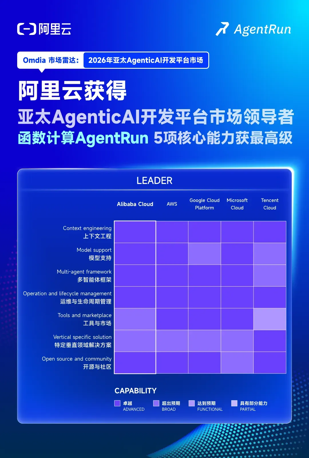 - Omdia 发布《2026年亚太Agentic AI开发平台市场评估报告》,阿里云凭借函数计算 AgentRun卓越的技术深度和全栈AI布局摘得“领导者”桂冠,5项核心能力获得最高评级(Advanced)