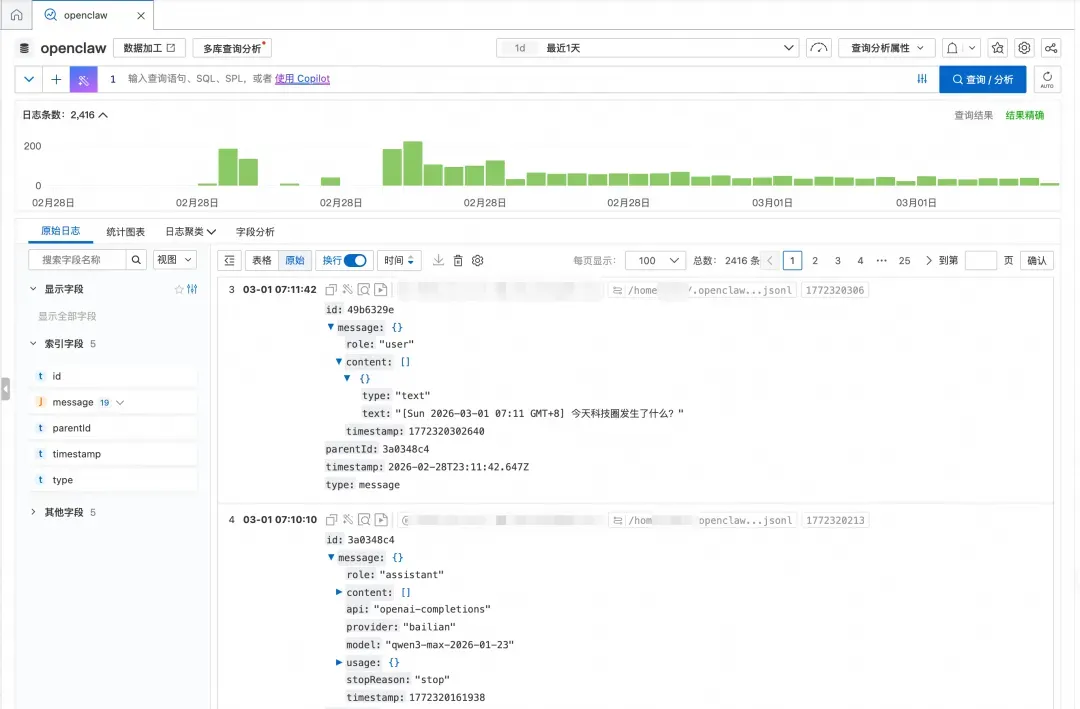 本文基于阿里云 SLS,将 OpenClaw 的三类可观测数据——Session 审计日志、应用日志、OTEL 指标与链路——统一汇入 SLS,形成“日志 + 指标 + 链路”的完整能力:Session 日志回答“Agent 做了什么、花了多少”;应用日志回答“系统哪里异常”;OTEL 回答“当前状态与耗时”。通过 LoongCollector 文件采集与 OTLP 直推,实现采集、索引、查询、仪表盘与告警的一站式闭环,并利用 SLS 的审计、权限与脱敏能力满足合规要求。