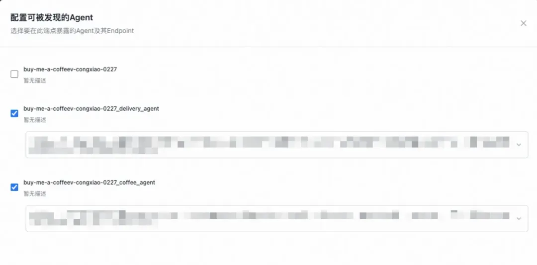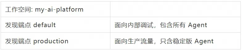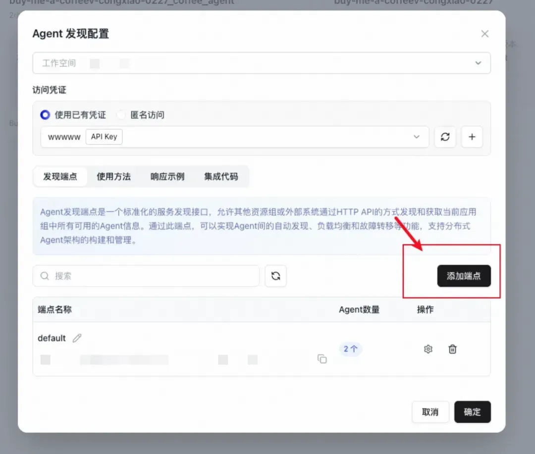 Agent 注册好之后,还需要在工作空间中配置「发现端点」,才能让外部调用方通过统一入口发现这些 Agent。