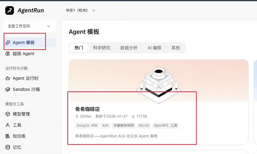 本文以「希希咖啡厅」多 Agent 系统作为演示对象。在 AgentRun 控制台的 Agent 模版页面找到该模版,点击一键部署,平台会自动创建并启动以下两个 Agent: