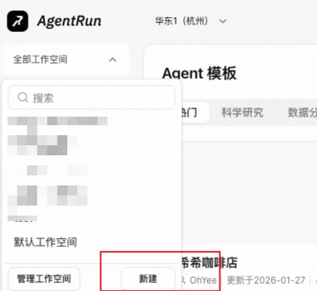 在 AgentRun 控制台新建一个工作空间(Workspace)。工作空间是组织和隔离 Agent 的基本单元,后续的服务发现都以工作空间为范围。