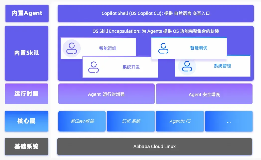 Agentic OS 架构借鉴传统操作系统的分层思想,通过核心层、运行时层,让 Agent 像应用程序一样运行在统一的基础设施之上。运行时层确保每个 Agent 在受控环境中安全执行。内置 Skill 提供开箱即用的通用能力,Agent 无需重复造轮子,结合最上层的 Copilot Shell (cosh),让 Agent 能像人操作终端一样调用系统资源。这种分层解耦的设计,使不同类型的 Agent 可以按需组合能力,兼顾安全、运维与可扩展性。