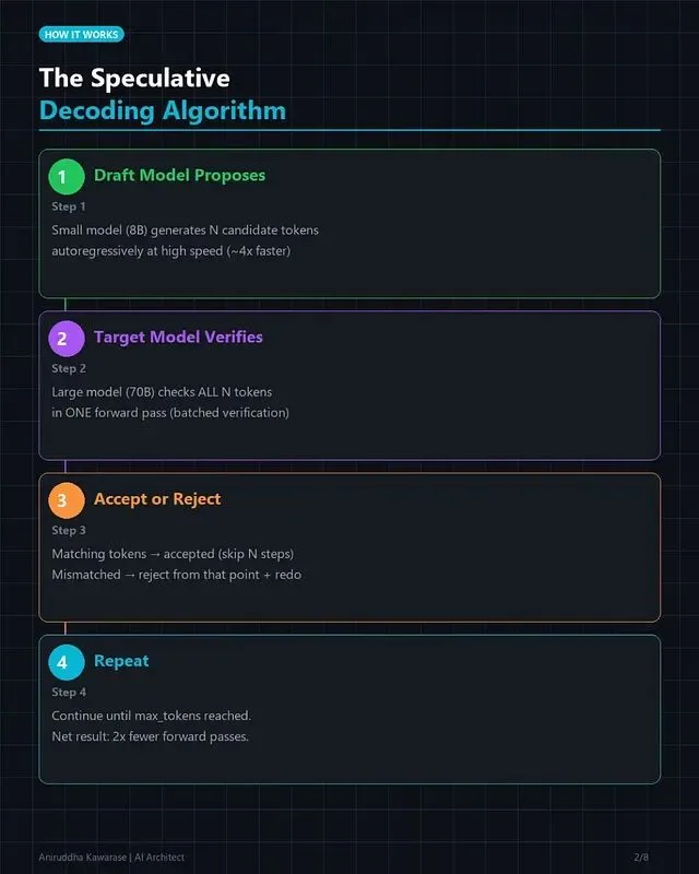 第一步:草稿生成。一个小型草稿模型(比如 Llama-3 8B)以自回归方式快速生成 K 个候选 token。小模型只占 GPU 显存的一小部分,单 token 生成速度比大模型快约 10 倍。