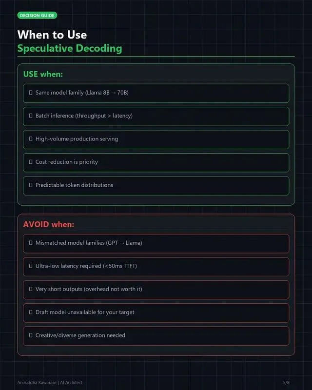 而下面几类场景应当规避。对 TTFT 有硬性要求的实时对话(SLA < 100ms)中,树初始化带来的 10–20ms 额外开销不可忽视。高温度创意生成(temperature > 1.0)下输出分布过于平坦,接受率跌到 60% 以下,加速收益被草稿开销抵消。跨家族模型搭配因训练分布差异过大,接受率撑不起加速。输出很短的任务(< 50 tokens)——分类、简短问答——初始化开销来不及摊薄。显存已满的环境同样不适用,70B 模型在 80GB 上本就吃紧,再加草稿模型只会溢出。