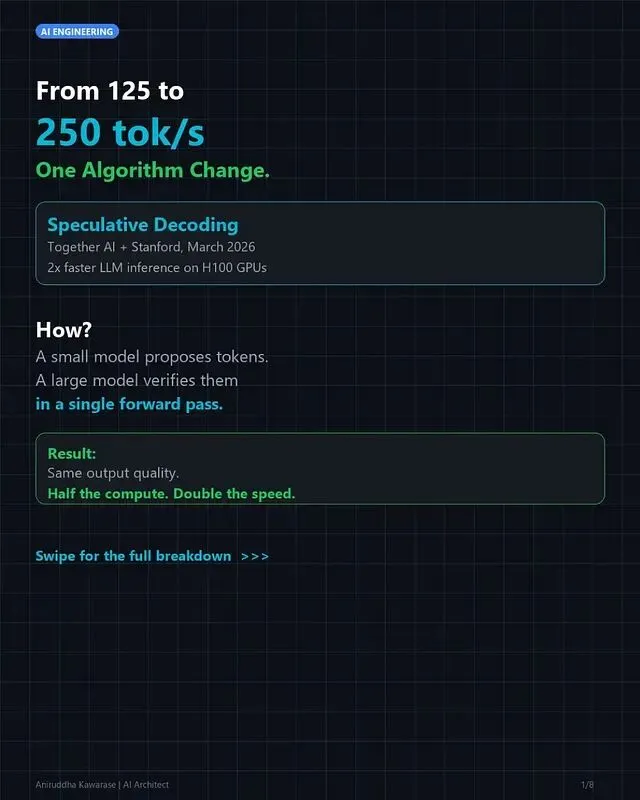 生产环境中真正烧钱、拖慢体验的环节不是训练、是推理。自回归的方式一次只产出一个 token,每个 token 都要完整走一遍模型所有层的前向传播。70B 参数的模型在 H100 上运行,每个 token 对应 700 亿次乘累加运算,而 GPU 大部分时间都在等内存搬运数据,真正用于计算的比例很低。