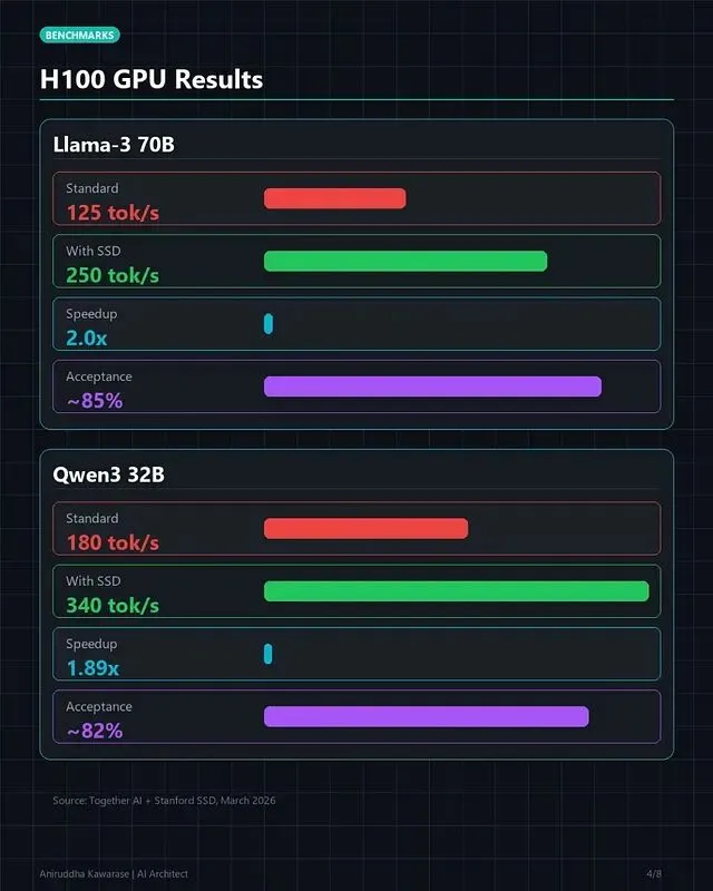 放到实际尺度来看:每天在 H100 上处理 1000 万 token 的服务,基线方案需要 4 张 GPU 才能在负载下维持 200ms 以内的 TTFT,SSD 只需 2 张就能满足同样的 SLA。按按需云定价折算,年度节省约 150,000 美元。