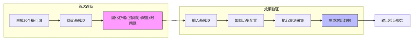诊断基线建立之后,效果验证的本质就变得极为清晰:用同一套提问词、在同等实验条件下,再次执行数据采集与分析,精确计算各项指标的变化量。